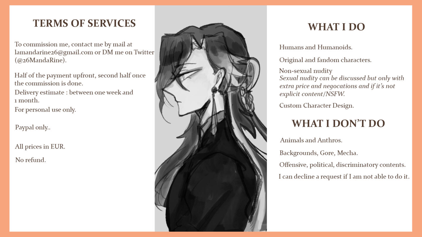 Hi, I am student in 3D Animation/Game Art and I really like drawing and create stuff. I can take commission sometimes. Read below to have more informations and the terms of my service.